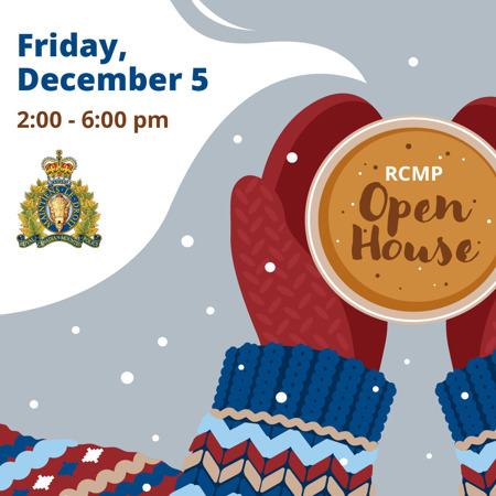 Join us for the RCMP Christmas Open House on Friday, December 5 from 2:00 - 6:00 pm. Kids can help decorate a police vehicle and enjoy hot chocolate, cookies, and holiday crafts.